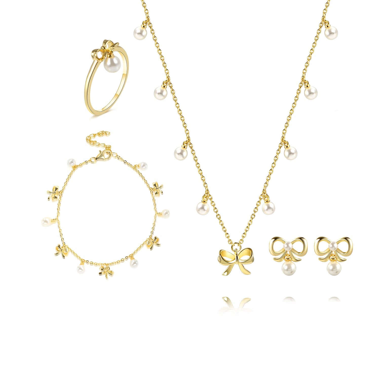 Coquette Charm Adorable Pearl Ring Bracelet Necklace Delicate Stud Earrings Set designed by Katie