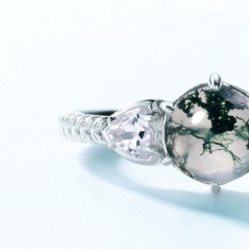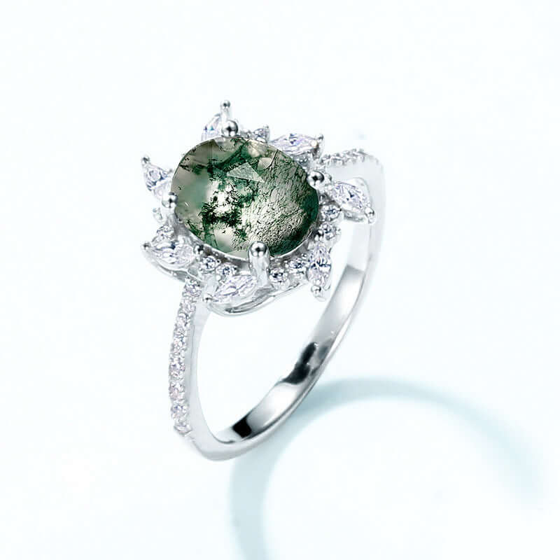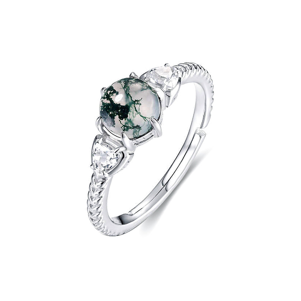 S925 Silver CZ Diamond Round Moss Agate Ring