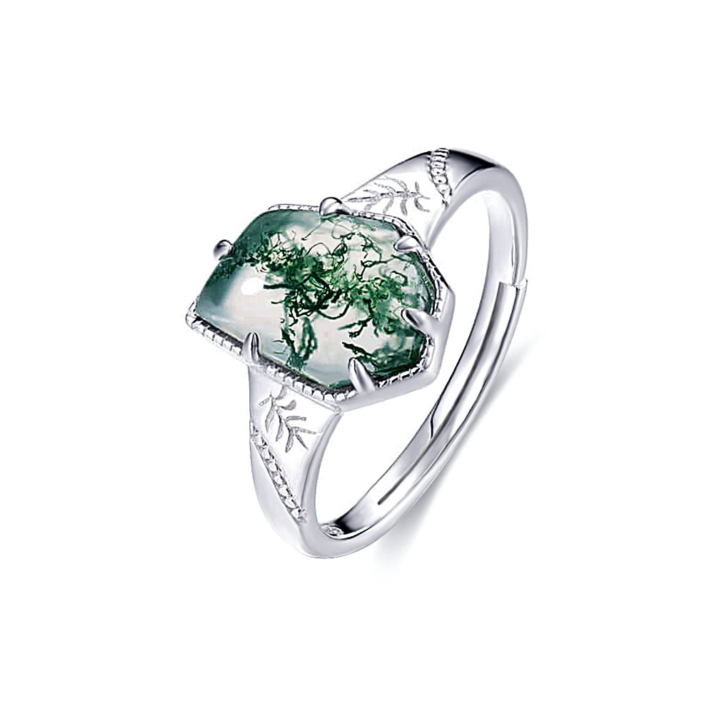 S925 Blatt-Polygon-Moos-Achat-Eingriffs-Verstellbarer Ring