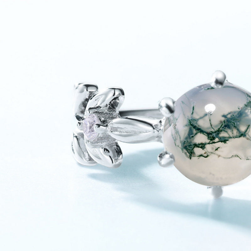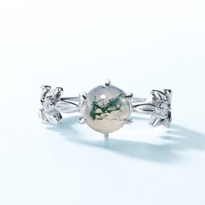 S925 Silberne Blume Grün Moos Achat Verlobungsring