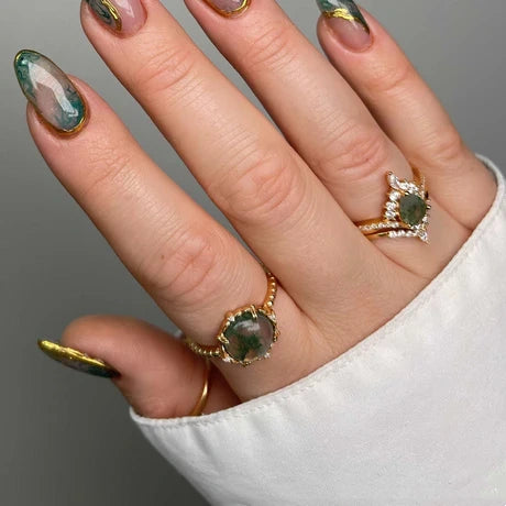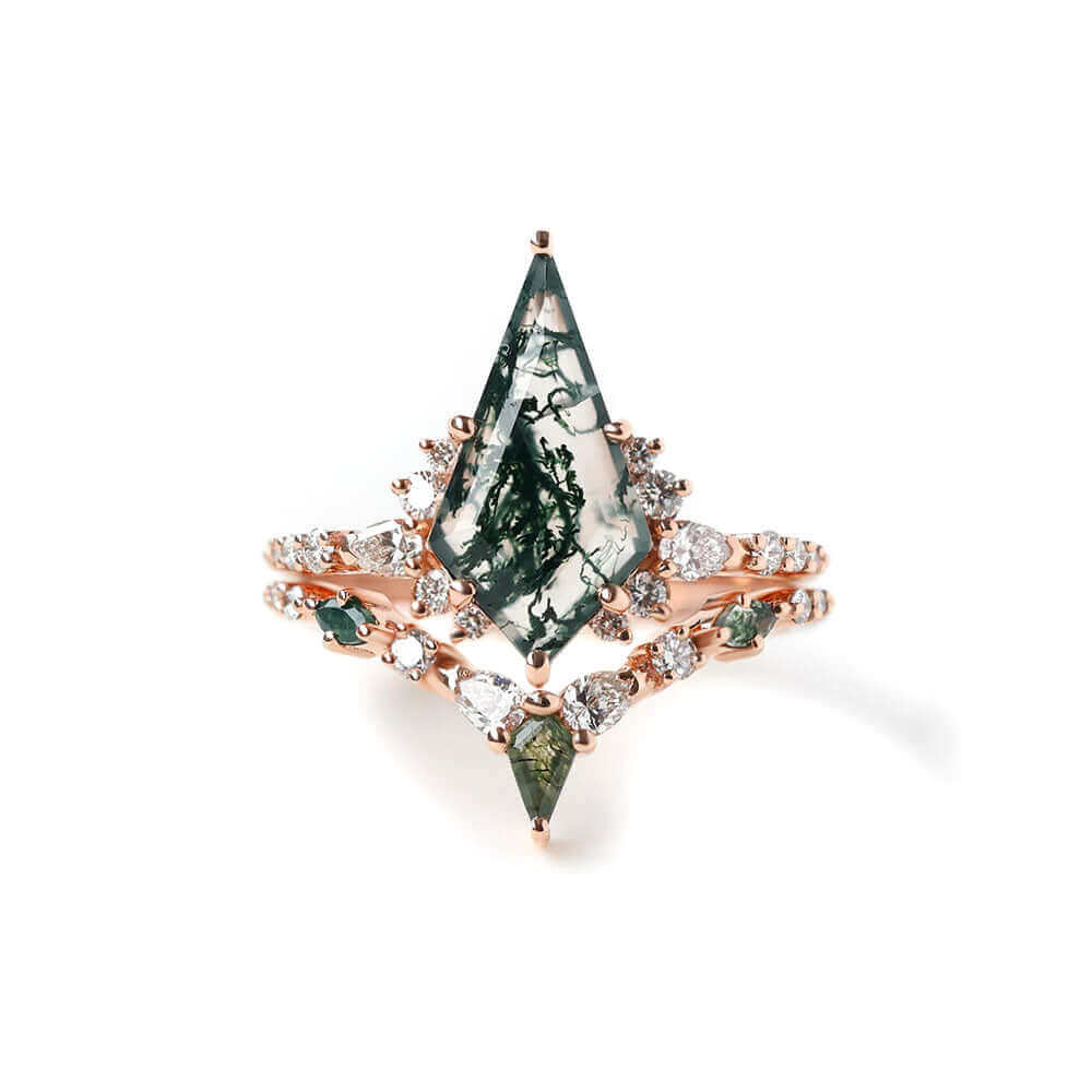 Trendolla 14K Gold Polygon Leaf Moss Agate And CZ Diamond Ring Set
