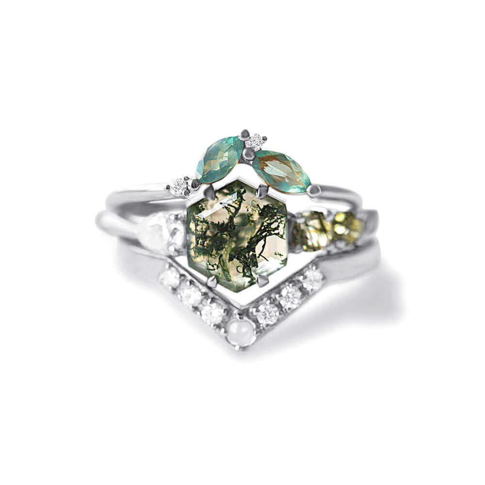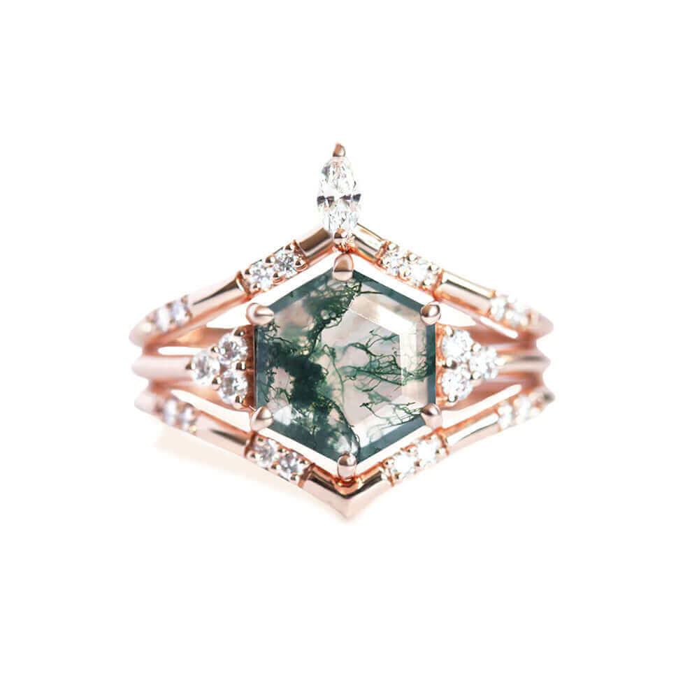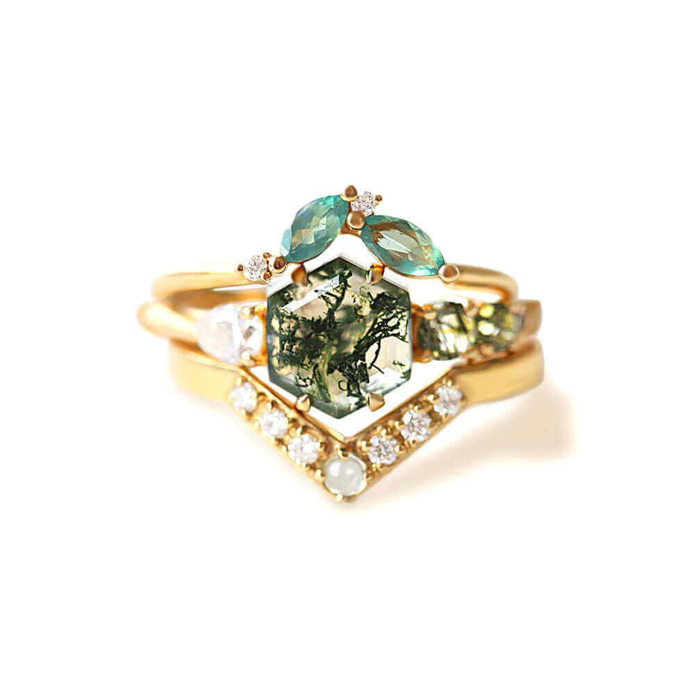 Trendolla 14K Gold Hexagon Moss Agate And CZ Diamond Ring Set