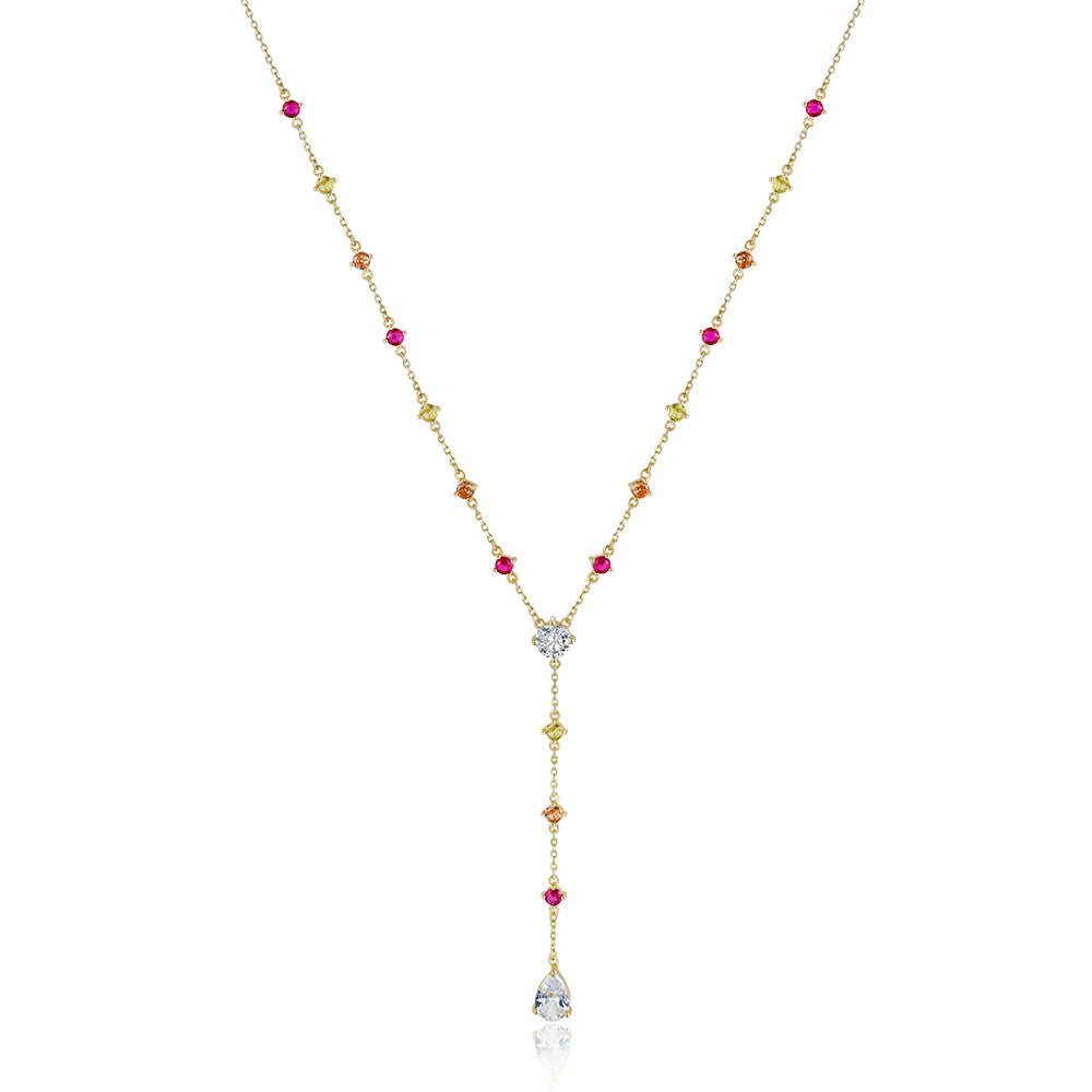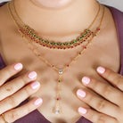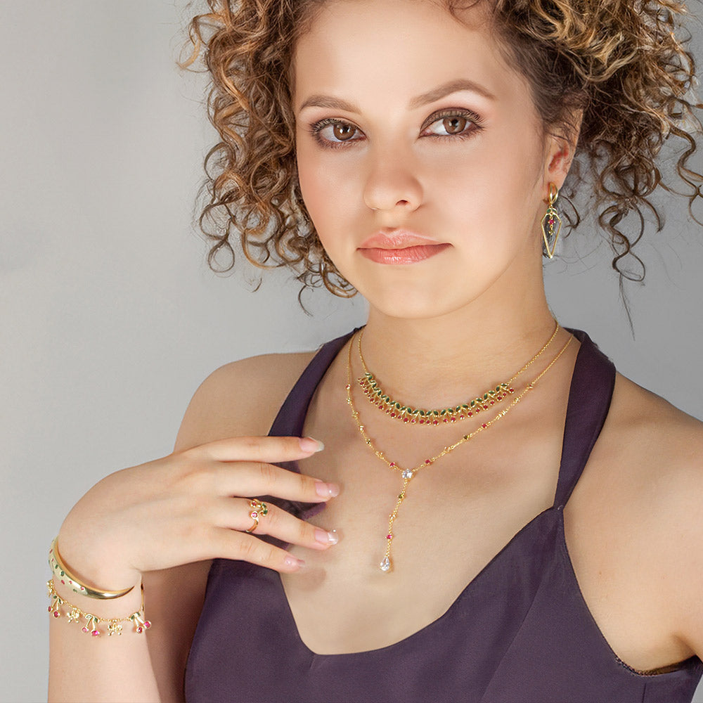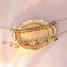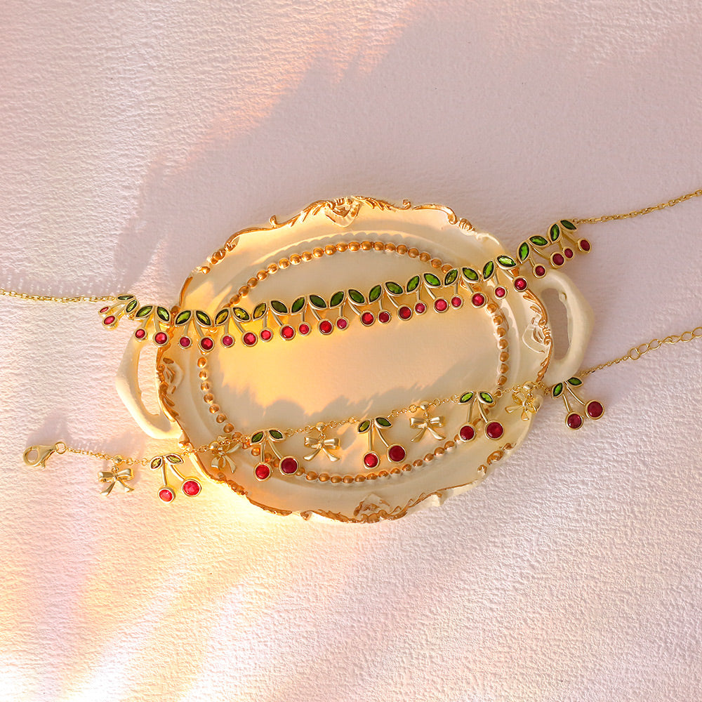 A stunning necklace inspired by the natural beauty of ripe cherries, featuring delicate ruby-hued gemstones and glossy green leaf-shaped accents, paired with luxurious gold-plated details. Perfect for layering or wearing solo, it adds a playful yet sophisticated vibe to your outfit.
