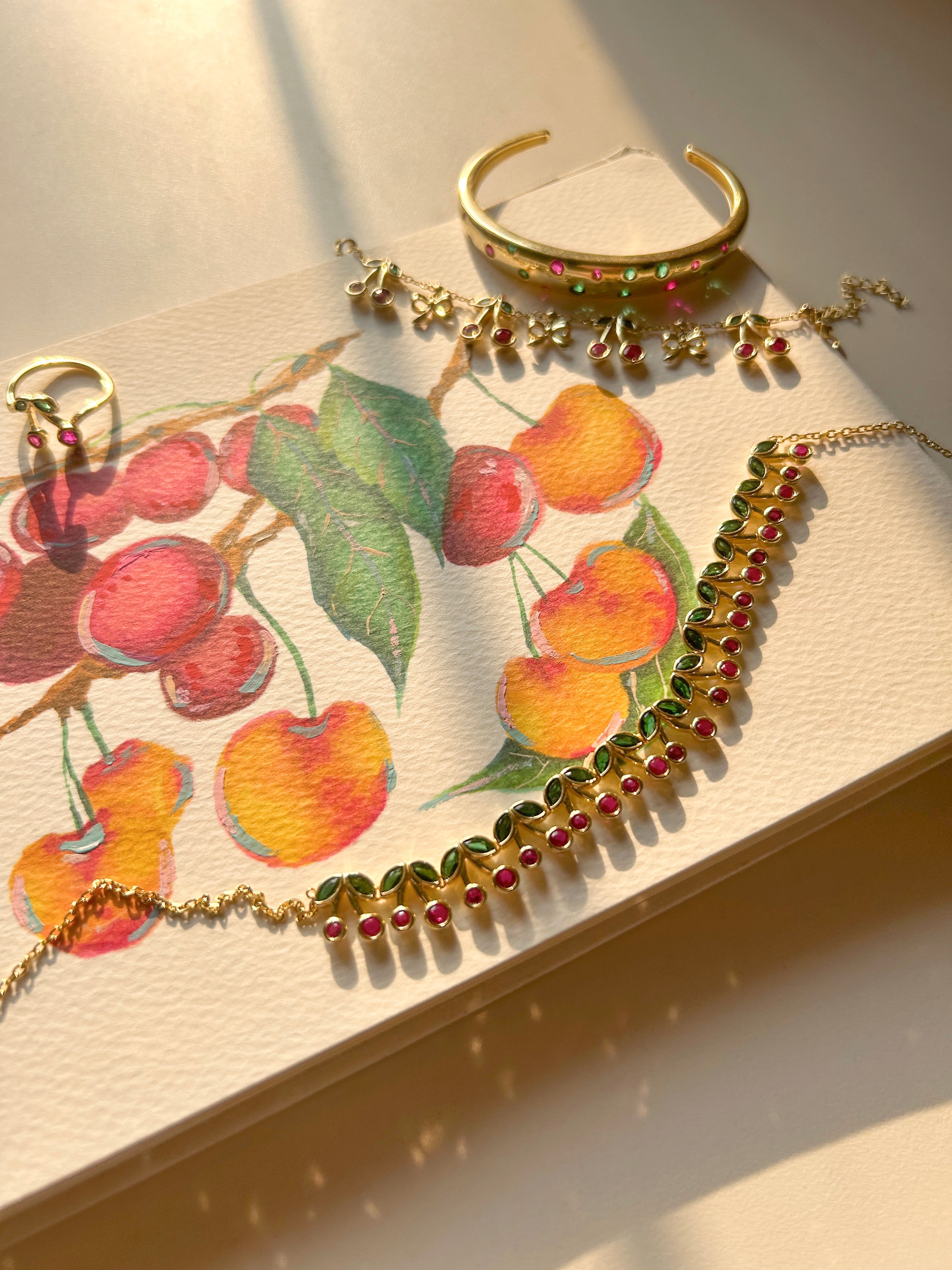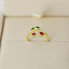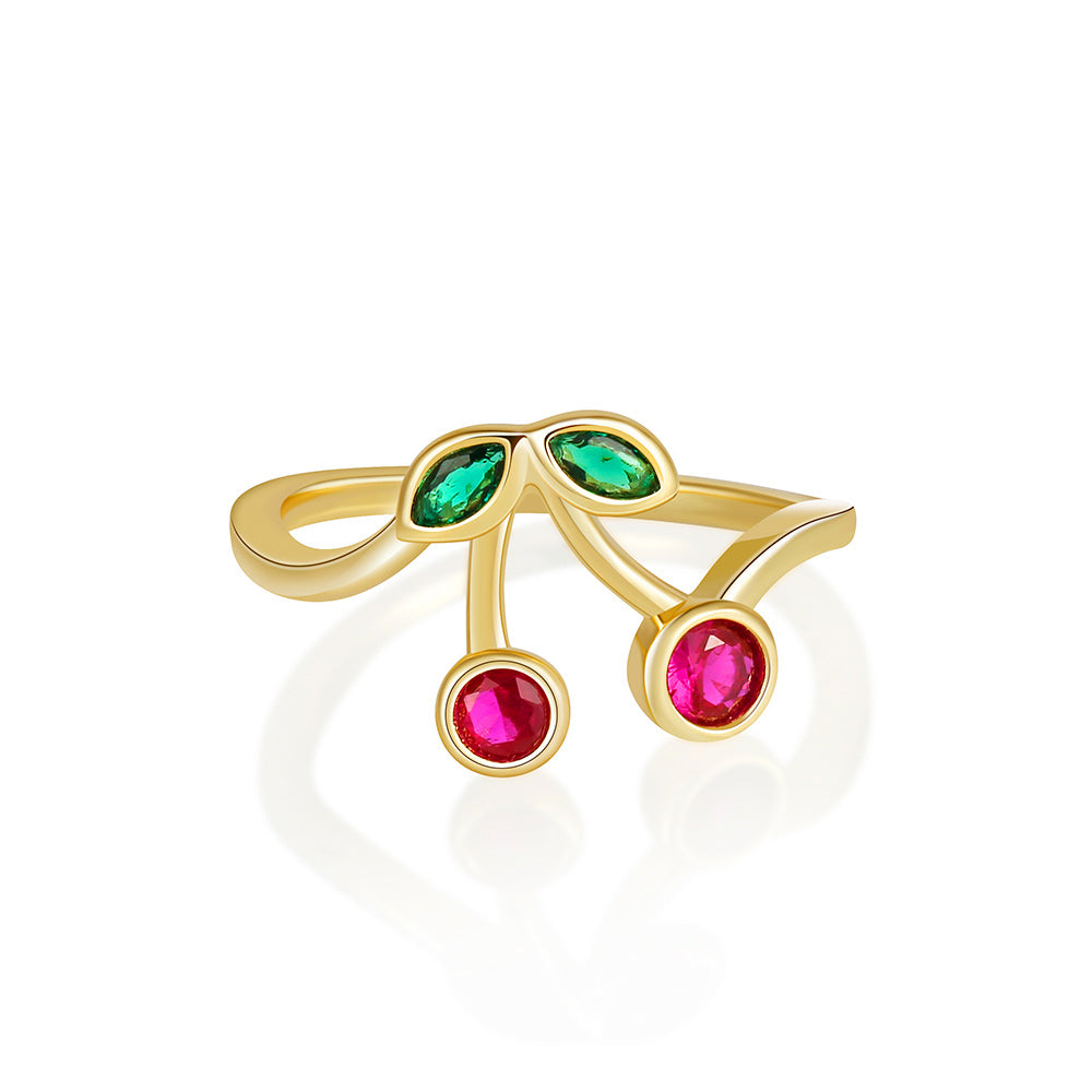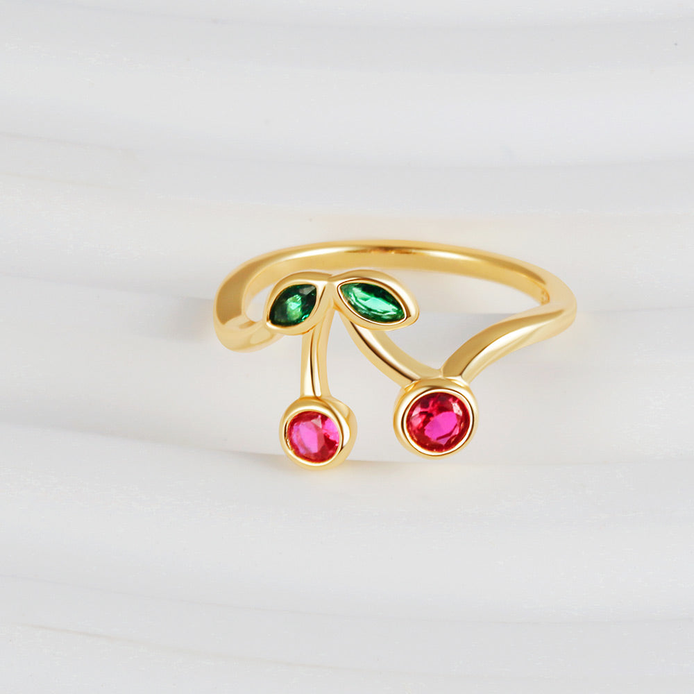 Capturing the charm of cherries with radiant ruby-colored stones and shimmering green accents, this ring brings a playful yet polished touch to your hand. Its delicate design makes it a versatile choice for everyday elegance.