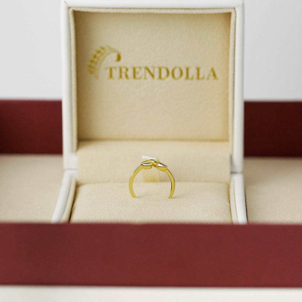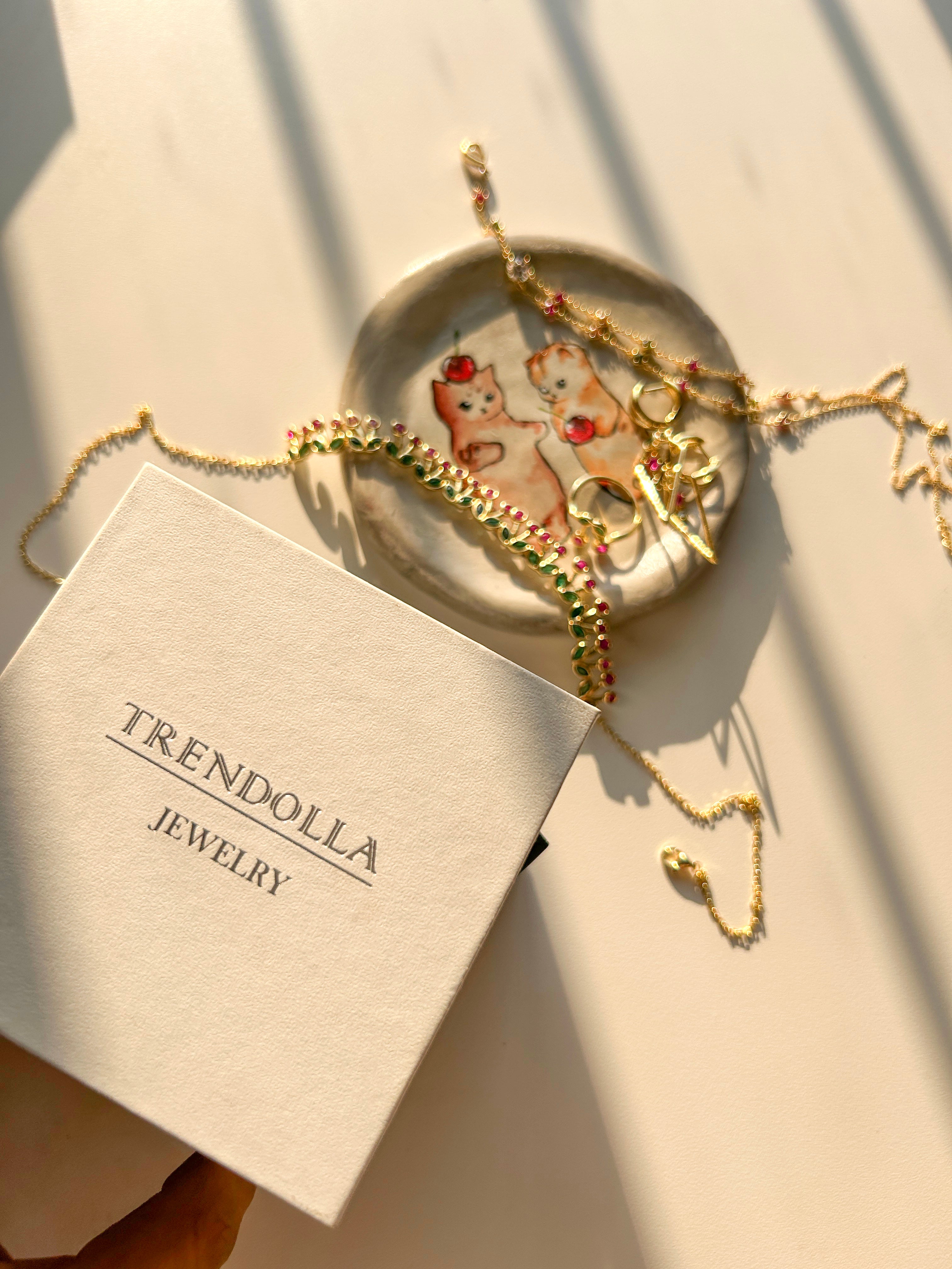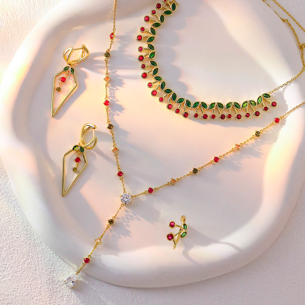 Capturing the charm of cherries with radiant ruby-colored stones and shimmering green accents, this ring brings a playful yet polished touch to your hand. Its delicate design makes it a versatile choice for everyday elegance.